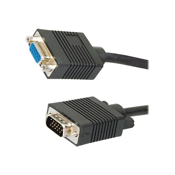 The 4XEM™ 15′ black VGA high-resolution M/F extension cable for monitor/KVM switch/video devices, is suitable to use in top performance VGA applications. This coaxial cable with 28 AWG conductor has foil shielding for protection against EMI/RFI interference. It features fully molded, nickel-plated connectors having easy-to-use long thumbscrews for a secure and quick connection. It has one 15-pin HD-15 male VGA on one end and one 15-pin HD-15 female VGA other end for connectivity.
