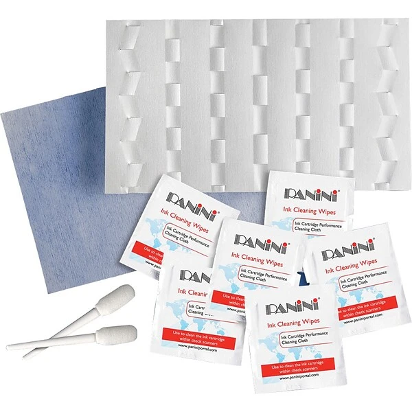 This Kit is specifically designed to clean Panini Check Scanners, remove endorsement ink residue, paper flash, and other debris left behind during normal operation from cameras and pathways within Panini Vision X™ and My Vision X® Check Scanners. The kit contains 6 Panini Cleaning Swabs, 1 Pack Dry Wipes and 25 Panini Check Scanner Cleaning Cards, the only preventive maintenance cleaning card on the market that can successfully maintain Panini Check Scanner. Engineered to Panini specifications, it cleans the sensitive magnetic heads, lenses and transport rollers within the scanner.