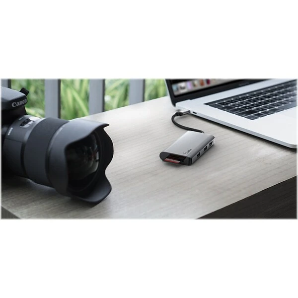 Connect a MacBook, Chromebook, or other USB Type-C laptop to a 4K display and additional devices with this Belkin CONNECT five-in-one multiport USB Type-C adapter hub. Its slim, compact, and durable aluminum casing makes it a perfect adapter when on the road, at home, at the office, or in the classroom. Access USB ports on modern laptops through a single USB Type-C cable, and extend your display to a 4K monitor through its HDMI port, delivering videos up to 4K at 30Hz. Great for photographers, videographers, and content creators, as the SD and microSD card slots allow for a fast transfer of data, images, and video. Connect to additional devices or peripherals with the 2 x USB Type-A ports.