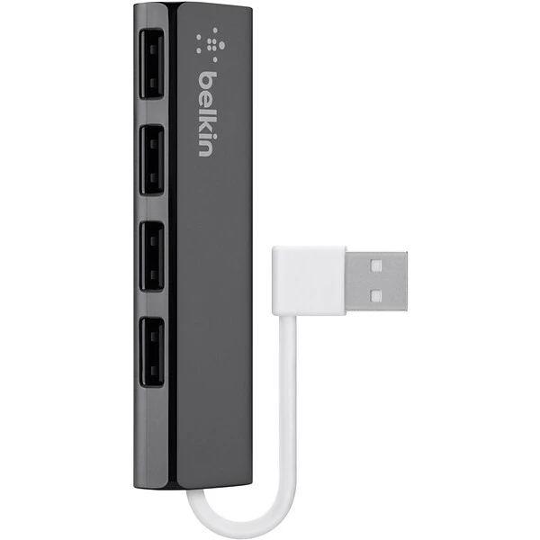 The Belkin ™ black ultra-slim travel USB hub adds four quick access USB ports to your PC, Mac or laptop/netbook/ultrabook. It transmits data at the rate of 480 Mbps. It is ideal for connecting a keyboard, mouse, thumb drive, charging cable or any other USB-enabled device. This plug and play hub does not require installation of drivers. It is Mac/PC compatible.