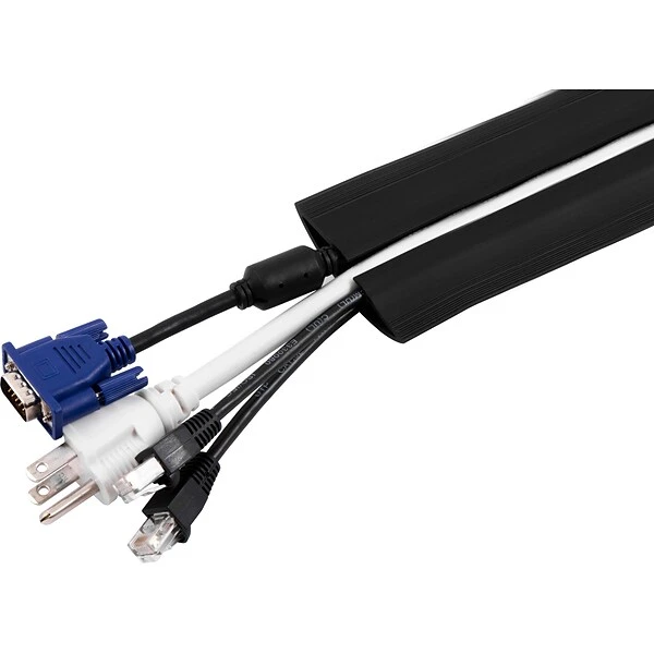 Cordinate Floor Cord Covers are designed with safety and performance in mind. While most floor cord covers create an unsightly obstacle, this unit’s tapered design, narrow width and 6ft. length provide a discreet, low-profile appearance that reduces the chance of tripping while not being obstructive. The black finish ensures that this floor cord cover will blend in seamlessly with the existing décor of any home, business, office, event space, warehouse or classroom. With Cordinate Floor Cord Covers, you no longer have to choose between style and function. The durable covers are made from a resilient PVC material that is engineered to provide safety and security and can be easily cut to any desired length. This all-in-one package also includes double-sided tape to make your installation quick and easy. Simply slide wires, cables and cords into the pre-slit bottom of the unit and secure to the desired surface.