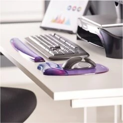 Type comfortably all day with this Crystals gel keyboard wrist rest. Filled with supportive gel, this cushion provides support while you type and holds your wrists at an ergonomically correct angle to minimize pressure on your joints. This Fellowes wrist rest stays firmly in place during use with a non-skid base and brightens up your desk with a brilliant purple hue.