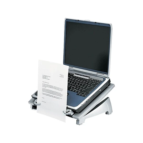 Prop up a 17-inch or smaller laptop with this durable riser. The stabilizing front edge keeps your laptop from slipping during use, and the 360-degree swivel feet let you easily adjust the positioning. Slip papers into the in-line document holder for hands-free reading. This Fellowes Office Suites laptop riser has cooling vents to prevent heat build-up under your computer.