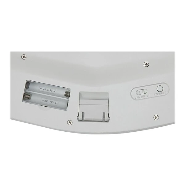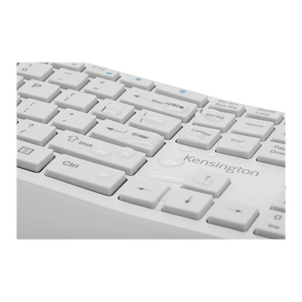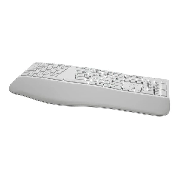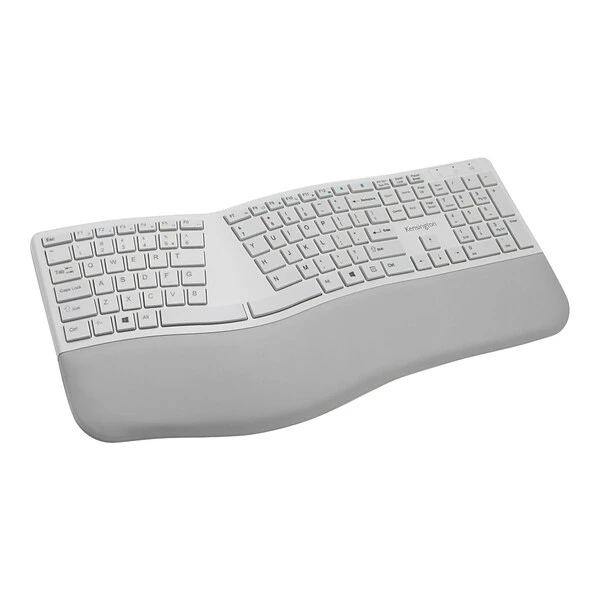 The Kensington Pro Fit Ergo split and sloped keyboard comes with adjustable reverse tilt and a built-in wrist rest. This ergonomist-approved wireless keyboard positions your hands for improved comfort. Its features include dual wireless connectivity (2.4GHz and Bluetooth 4.0 LE) with 128-bit AES encryption security; quiet typing; spill-proof keys; F-keys for shortcuts; caps lock, number lock, and scroll lock; a three-mode power-saving switch; and a replaceable receiver.