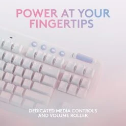 The Aurora G715 wireless gaming keyboard is a compact, comfy keyboard that delivers low-key vibes with high-key performance, so you can express yourself and play your way. Float away with the dreamy white design and cloud-soft palm rest. A compact, tenkeyless layout and adjustable height give that good game feeling, all-day long. Pack up the keyboard, place it anywhere, and play your best with a rechargeable 25-hour battery life and LIGHTSPEED wireless or Bluetooth connectivity. Show off your playstyle with ethereal LIGHTSYNC RGB on the keyboard perimeter and under the keys, along with out-of-the-box Aurora collection signature lighting.
