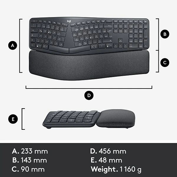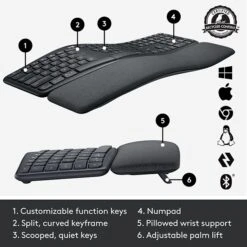 - SPLIT, CURVED KEYFRAME – Type more naturally with an ergonomic keyframe that improves typing posture. The sloping keyboard reduces muscle strain on your wrists and forearms.