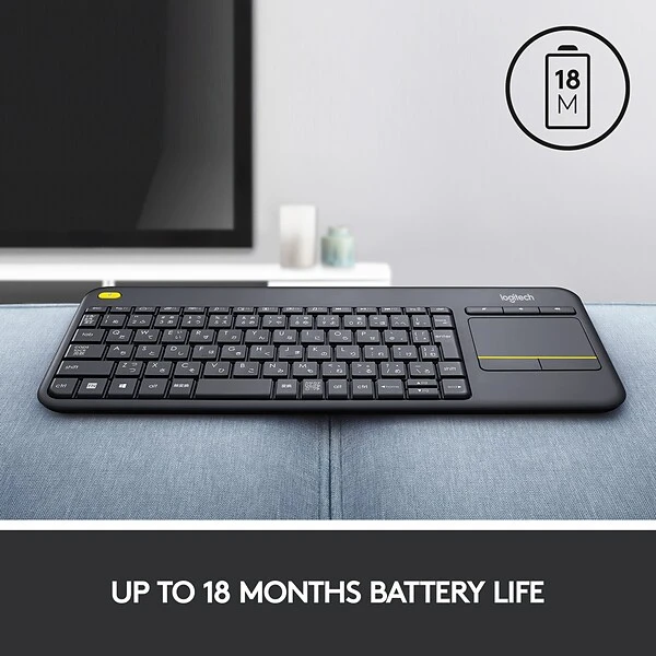 The Logitech® Wireless Touch Keyboard K400 Plus lets you experience PC-to-TV entertainment the way you Watch video, browse the web, chat with friends and much more. The all-in-one keyboard with touchpad ends the hassle—and clutter—of multiple devices. And a 10-meter (33-foot)¹ wireless range ensures your fun won’t be interrupted. Comfortable, quiet keys and a large (3.5-inch) touchpad make navigating entertainment effortless. Even setup is a snap thanks to the tiny, plug-and-play Unifying receiver. The 18-month² battery life means you might even forget the keyboard needs batteries. 1 Wireless range may vary depending on operating environment and computer setup. ² Assumes up to two hours typing per day. Actual battery life will vary with use, settings and environmental conditions.
