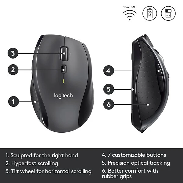 Logitech Wireless Mouse Marathon M705 lets you power on… and on. It uses far less power than comparable wireless mice from other companies, so you’ll go up to three full years between battery changes.* And it uses a tiny wireless receiver that stays plugged in to your computer, so your mouse is ready to go-whenever, wherever, and for as long as it takes. Plus, hyper-fast scrolling means you’ll fly through long documents to find what you need in a flash. Advanced Optical Tracking means you’ll get smooth, responsive cursor control. And the sculpted, right-hand shape means you’ll be as comfortable finishing up as you were getting started.