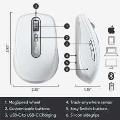 Be 50% more productive with a mouse compared to a touchpad. Create, make, and do anywhere with a compact performance mouse designed for your Mac no matter where you work – from the home office, to the cafe, to the airport lounge. The electromagnetic MagSpeed scroll wheel is faster, quieter, and more precise. A low-profile design is contoured for the shape of your hand, while silicone side grips ensure that it’s always soft to the touch. Logitech MX Anywhere 3 for Mac is built to withstand the bumps and drops of mobile work.
