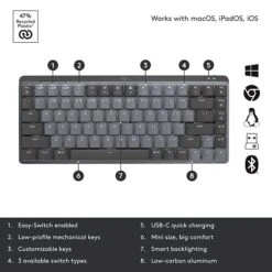 Introducing MX Mechanical Mini – a minimalist keyboard with extraordinary feel, precision, and performance. Low-profile mechanical typing delivers satisfying feedback in your choice of key switches – Tactile Quiet, Clicky, or Linear. MX Mechanical Mini is crafted for ergonomic comfort, with smart illumination and Easy-Switch – allowing you to connect up to 3 devices and stay in your flow for hours. Fluid and quiet mechanical typing: MX Mechanical Mini keyboard features Tactile Quiet switches that deliver next-level feel and flow with less noise – Clicky and Linear switches are also available. A keyboard layout designed for effortless precision, with a small, compact form factor and low-profile mechanical switches for better ergonomics. Backlit keys light up the moment your hands approach the cordless keyboard and automatically adjust to suit changing lighting conditions. Customize Fn keys, assign backlighting effects, enable Flow cross-computer, multi-device control, and more in the improved Logi Options+. Pair MX Mechanical Mini Bluetooth wireless keyboard with up to 3 devices on nearly any operating system via Bluetooth Low Energy or included Logi Bolt receiver. MX Mechanical Mini keyboard stays powered up to 15 days on a full charge or up to 10 months with the backlighting turned off. If you crunch numbers frequently, a full-size keyboard form factor with an integrated numpad is also available.