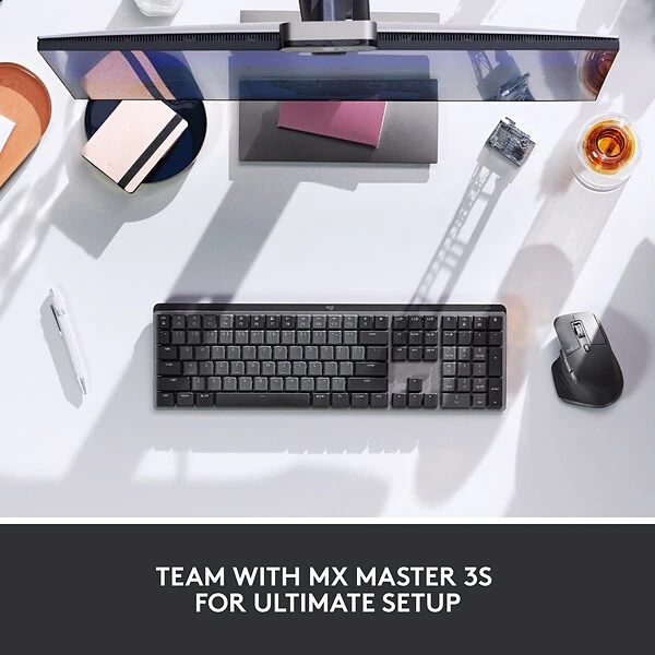 Introducing Logitech MX Mechanical – a full-size keyboard with extraordinary feel, precision, and performance. Low-profile mechanical keys in your choice of 3 switch types deliver satisfying feedback with every keystroke. Your fingers glide effortlessly across the matte surface of the keys – and dual color keycaps guide peripheral vision to make it easy to orient your fingers and stay in your flow. The full-size form factor of MX Mechanical features an integrated numpad – with a design that promotes better posture and improved ergonomics. Backlit keys automatically adjust to suit changing lighting conditions. MX Mechanical also boasts multi-device, multi OS connectivity via Bluetooth Low Energy – and USB-C recharging. Fluid and quiet mechanical typing: MX Mechanical keyboard features Clicky switches that deliver next-level feel and flow with less noise – Tactile and Linear switches are also available. Low-profile keys, more comfort: A keyboard layout designed for effortless precision, with a full-size form factor and low-profile mechanical switches for better ergonomics. Smart illumination: Backlit keys light up the moment your hands approach the cordless keyboard and automatically adjust to suit changing lighting conditions. Faster workflow, more customization: Customize Fn keys, assign backlighting effects, enable Flow cross-computer, multi-device control, and more in the improved Logi Options+. Multi-device, multi-OS: Pair MX Mechanical Bluetooth wireless keyboard with up to 3 devices on nearly any operating system via Bluetooth Low Energy or included Logi Bolt receiver. USB-C quick charging: MX Mechanical keyboard stays powered up to 15 days on a full charge or up to 10 months with the backlighting turned off.
