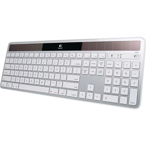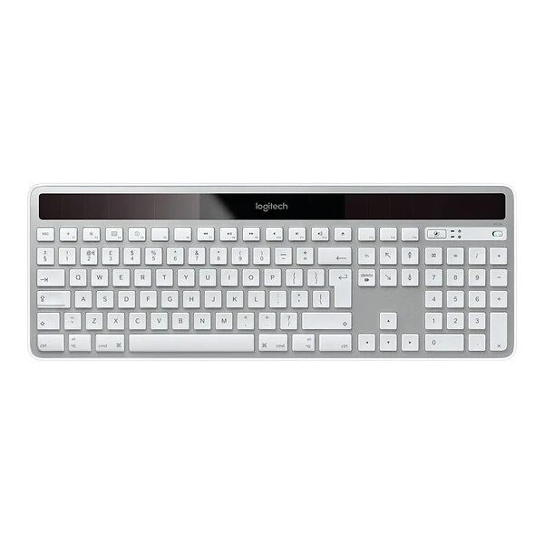 Free yourself from cables and chargers with this Logitech K750 Wireless Solar Keyboard for Mac. The thin streamlined design of this full-featured Mac keyboard provides style and portability that’s perfect for use in offices and on the road. This Logitech K750 Wireless Solar Keyboard for Mac works for up to three months per full charge and uses solar panels to conveniently recharge with ambient light. The Logitech K750 Wireless Solar Keyboard for Mac replenishes its energy reserves with sunlight or lamplight, indoors or outdoors, and lasts for three months on a full charge. This silver wireless solar keyboard features a concave key cap design, allowing you to enjoy faster, quieter typing. With a streamlined profile only 1/3 inch thick, a familiar Mac keyboard layout, and Logitech 2.4 GHz wireless connectivity, this wireless solar-powered keyboard offers complete freedom from batteries and cords.