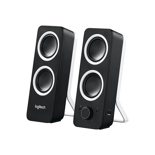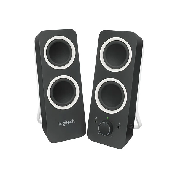 Improve your speaking engagements with these Logitech Z200 stereo speakers. This 10-watt speaker system easily connects to a variety of devices and enhances listening and viewing experiences with powerful, accurate stereo sound. Featuring two active and two passive drivers, this system delivers clear high notes and resounding bass and boasts an intuitive tone control knob for on-the-fly bass adjustments. These Logitech Z200 stereo speakers feature a control setup on the right speaker that makes it easy to plug in headphones and quickly change volume settings.