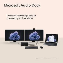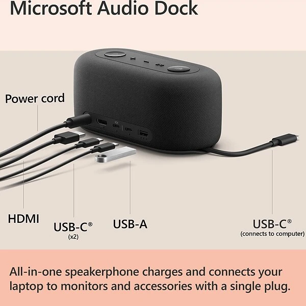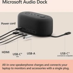 Microsoft Audio Dock features four different ports (HDMI, USB-A, and two USB-C®) and a power pass-through to keep your PC fully charged all day. Connect up to two monitors with HDMI and USB-C® connections. Be heard clearly during online meetings. Multi-dimensional sound for music and meetings. Compatible with the apps you use today. Certified for Microsoft Teams