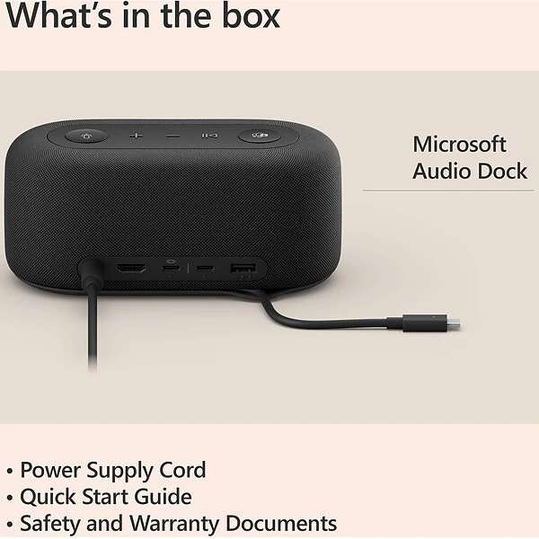- What’s in the box: Microsoft Audio Dock, Power Supply Unit & AC cord, Quick Start Guide, Safety and warranty documents