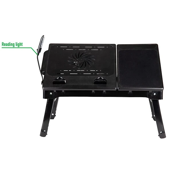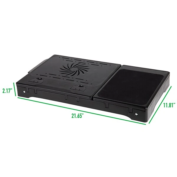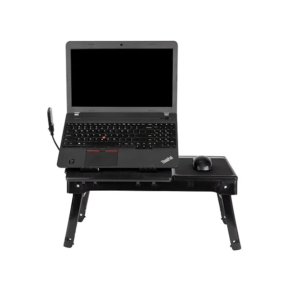 Breakfast in bed shouldn’t be a balancing act. Too many lap desks provide awkward, uncomfortable attempts at a flat surface. The Mind Reader lap desk offers a variety of positions for your comfort and convenience, so you can enjoy a versatile, multifunction solution that allows you to work or eat in bed, on the couch, or even on the floor. Anywhere you need a flat, stable surface, you’ll want this durable lap desk on hand. Unfold the legs for an elevated desk that fits over your legs, or fold them flat underneath. Plug in the USB connection to power the four-port USB hub and cooling fan.