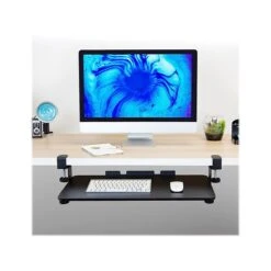 The clamp-on keyboard tray saves space by mounting your keyboard underneath your desk. Improve ergonomics by correctly positioning your elbows and wrists at the optimum height. The mount allows you to maintain a neutral working posture by positioning your keyboard and mouse lower and closer to your body. Easily position the mount by pushing or pulling the plate to adjust it. This mount eliminates the need to drill into your desk.