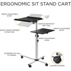 - Each tray can independently tilt up to 45 degrees and can raise and lower from 27″ high up to 35″