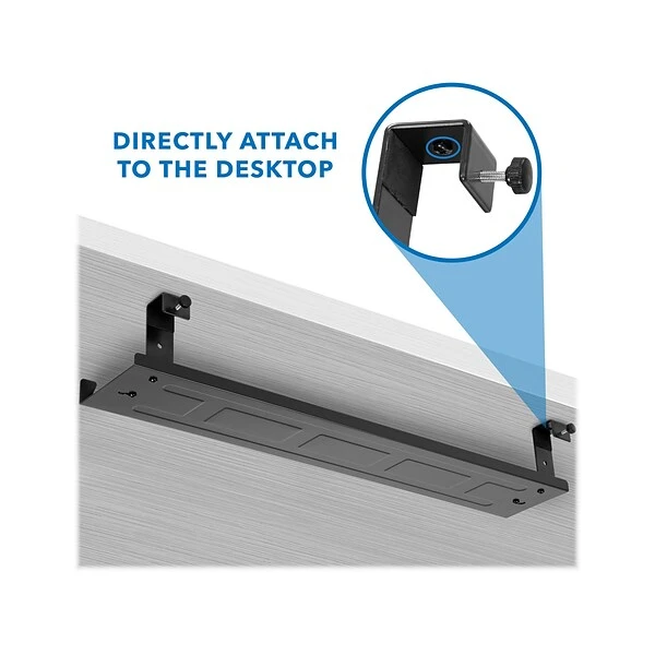 - Installs within minutes: hang on the crossbar of a sit-stand desk, or attach directly to the desktop