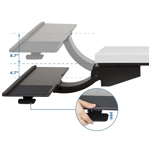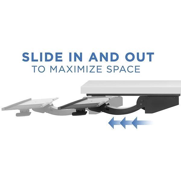 - UNDER-DESK TRAVEL: Keyboard tray slides underneath desk on tracks