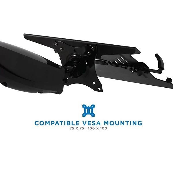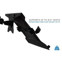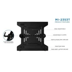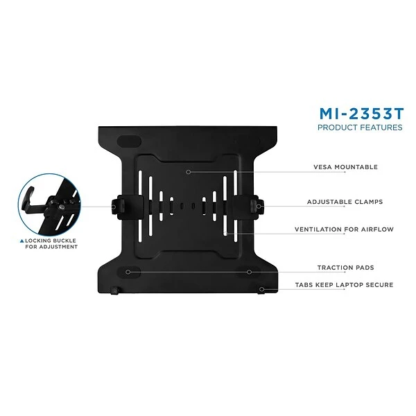 MI-2352T tray has adjustable clips on the side to fit nearly all brand and size laptops on the market. The tray measures 11 inch in height and 11.75 inches in width. The safety clips can expand up to 15.25 inches wide and retract to 9.5 inches to securely hold the laptop in place. Bottom lips prevent the laptop from sliding down. Universal laptop tray that connects to monitor mounts with VESA patterns. This tray is ideal to use on a dual monitor mount to place your laptop next to your monitor. You can also connect this tray to a height adjustable single monitor mount to use it as a full motion laptop arm.
