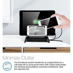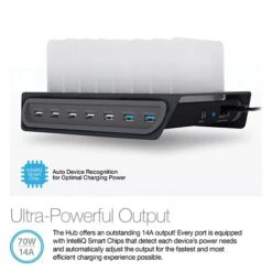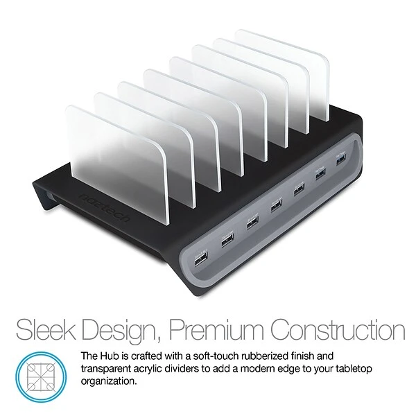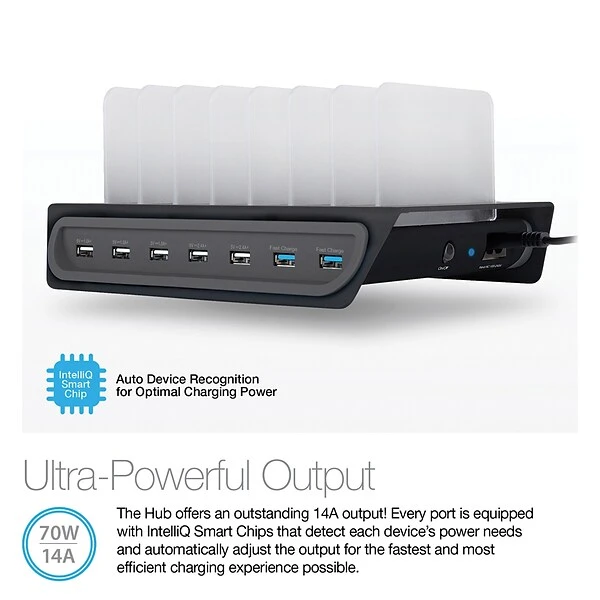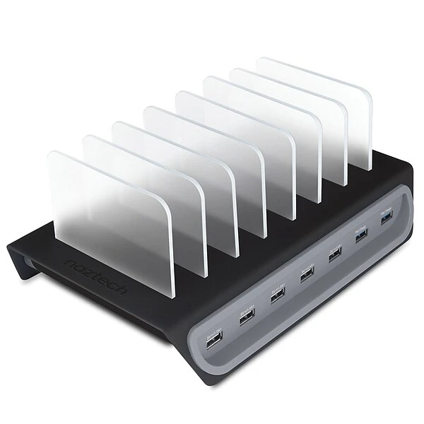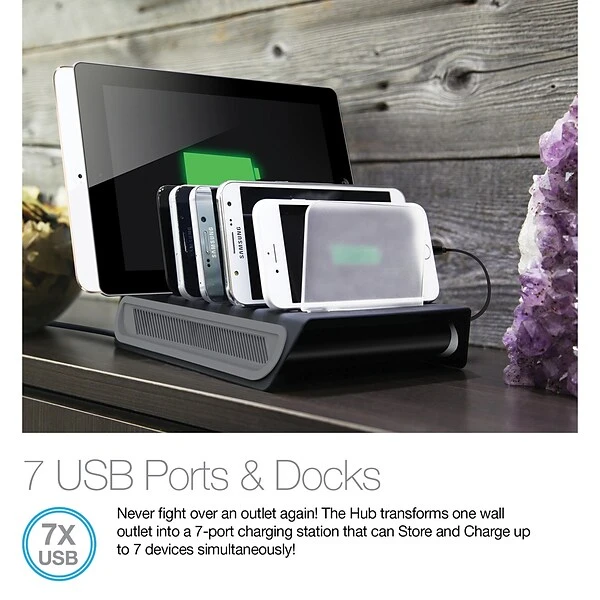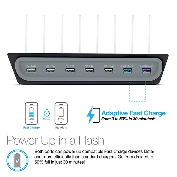 Minimize clutter, maximize power, and stop fighting over outlets. Turn any single AC outlet into a 7-port high-speed charging station that can power-up an entire household or office with the Naztech Adaptive Fast Charge Power Hub7! The incredible 14 amp output can charge 7 devices simultaneously! 2 ports feature cutting-edge Adaptive Fast Charge Technology, so compatible devices can go from drained to 50% full in just 30 minutes! Both ports are universal and can deliver a powerful tablet-friendly 2.4 amp output to non-Fast Charge devices. With a space-saving design and individual docking stations, your devices stay neatly arranged while charging.