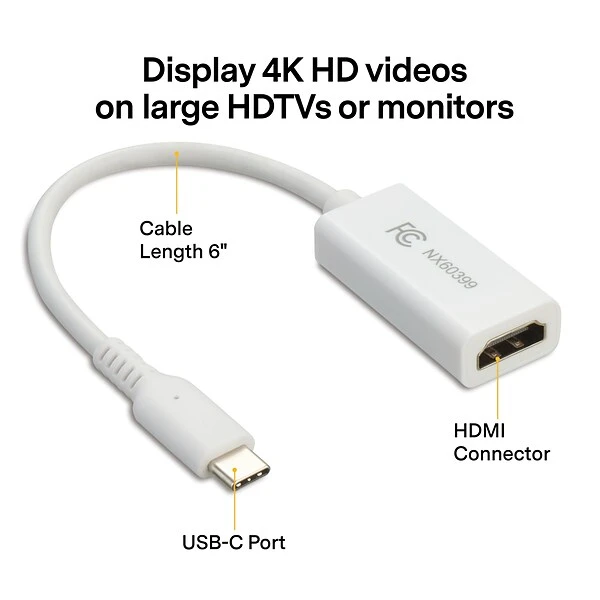 Send 4K video and audio to your HDMI-enabled output devices with this adapter. Compatibility with Mac, Chrome and Windows hardware enables use with various devices. This 10.2Gbps NXT Technologies white USB-C to HDMI adapter supports fast data transfer for seamless synchronization with high-performance work computers.