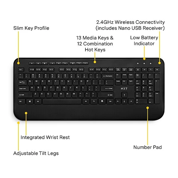 Experience ultrastable and reliable wireless connectivity of up to 23′ with this wireless keyboard. A combination of media keys and hot keys ensure quick access to favorite functions and allow for easy performance of day-to-day computing tasks. The low battery indicator keeps you informed when the battery needs replacing. This NXT Technologies™ wireless comfort keyboard is built with a slim key profile, while the integrated wrist rest and adjustable-tilt legs help provide ergonomic comfort during extended typing.