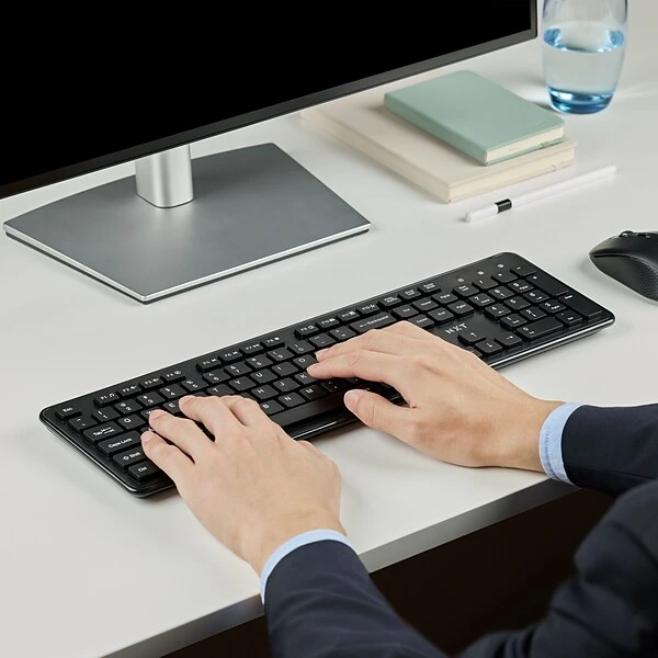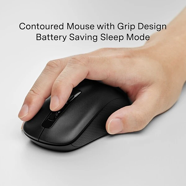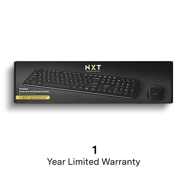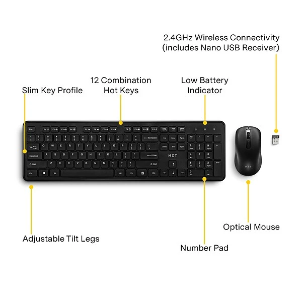 Work on your computer and improve productivity with this black wireless mouse and keyboard combo. The compact keyboard has adjustable-tilt legs to customize a comfortable typing position, helping minimize strain on your wrists during extended typing sessions. The wireless mouse featuring a contoured grip and optical sensor offers firm, comfortable handling and reliable tracking for precise control. Support for 2.4GHz wireless connectivity offers cable-free convenience, while compatibility with Windows and macOS allows for easy setup and integration with most computers. This NXT Technologies™ compact wireless mouse and keyboard combo features low battery indicators for timely changes to minimize downtime.