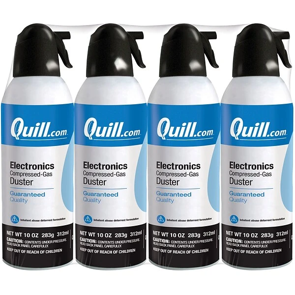 Keep electronic equipment clean without damaging any internal parts by using this Quill Brand® duster. Spray the contents on hard-to-reach areas to quickly clear them of dust and debris, removing dirt and extending the life of your technology. A slightly ethereal scent keeps your office smelling fresh.Easy to UseAim the duster at the area you want to clean, and squeeze the trigger to instantly shoot a burst of compressed air straight at your target. Watch as dirt and debris fly out of tiny cracks and crevices, amazing you with the cleaning power of this 10-ounce duster.Convenient PackagingDon’t be afraid to use this duster daily since you can stock up with enough of this 4-pack duster to keep your office equipment clean for several weeks. The 10-ounce duster cans are slim and easy to store in a closet or desk drawer without taking up a lot of space.Designed for SafetyProtect your valuable technology by cleaning it with this duster filled with safe liquefied gas. Avoid possible damage caused by liquid cleaners and rough handling. An added bitterant gives this duster an unpleasant taste to discourage its use as an inhalant.