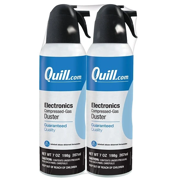 Keep electronic equipment clean without damaging any internal parts by using this Quill BrandĀ® duster. Spray the contents on hard-to-reach areas to quickly clear them of dust and debris, removing dirt and extending the life of your technology. A slightly ethereal scent keeps your office smelling fresh.Easy to UseAim the duster at the area you want to clean, and squeeze the trigger to instantly shoot a burst of compressed air straight at your target. Watch as dirt and debris fly out of tiny cracks and crevices, amazing you with the cleaning power of this 7-ounce duster.Convenient PackagingDon’t be afraid to use this duster daily since you can stock up with enough of this 2-pack duster to keep your office equipment clean for several weeks. The 7-ounce duster cans are slim and easy to store in a closet or desk drawer without taking up a lot of space.Designed for SafetyProtect your valuable technology by cleaning it with this duster filled with safe liquefied gas. Avoid possible damage caused by liquid cleaners and rough handling. An added bitterant gives this duster an unpleasant taste to discourage its use as an inhalant.
