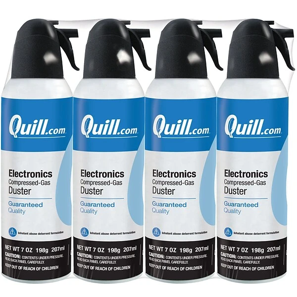 Keep electronic equipment clean without damaging any internal parts by using this Quill Brand® duster. Spray the contents on hard-to-reach areas to quickly clear them of dust and debris, removing dirt and extending the life of your technology. A slightly ethereal scent keeps your office smelling fresh.Easy to UseAim the duster at the area you want to clean, and squeeze the trigger to instantly shoot a burst of compressed air straight at your target. Watch as dirt and debris fly out of tiny cracks and crevices, amazing you with the cleaning power of this 7-ounce duster.Convenient PackagingDon’t be afraid to use this duster daily since you can stock up with enough of this 4-pack duster to keep your office equipment clean for several weeks. The 7-ounce duster cans are slim and easy to store in a closet or desk drawer without taking up a lot of space.Designed for SafetyProtect your valuable technology by cleaning it with this duster filled with safe liquefied gas. Avoid possible damage caused by liquid cleaners and rough handling. An added bitterant gives this duster an unpleasant taste to discourage its use as an inhalant.