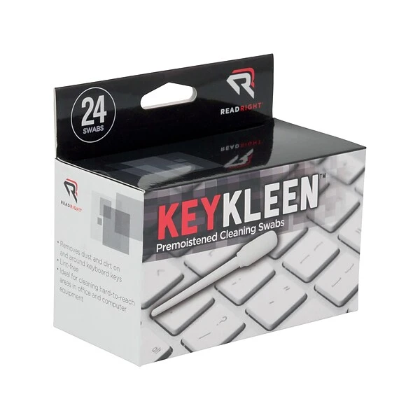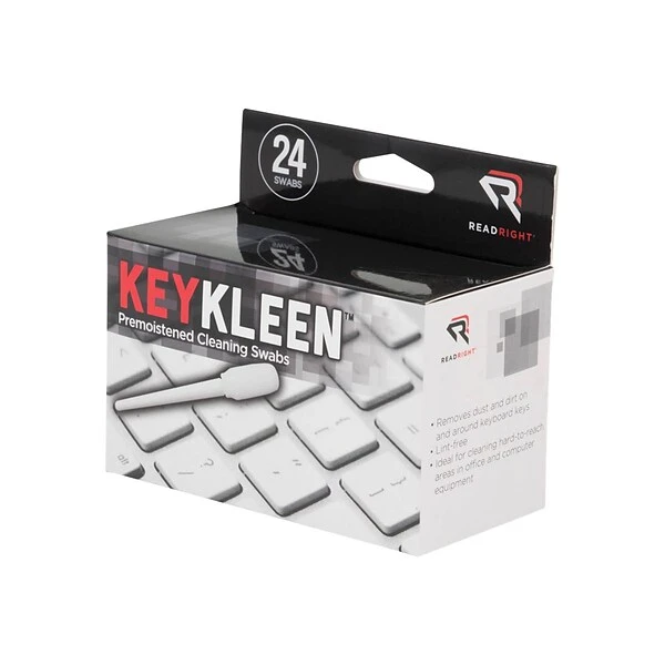 Get rid of hard-to-reach crumbs and debris with this box of 24 keyboard cleaning swabs. A special formula removes grime from tight spaces. These Advantus Read Right KeyKleen swabs dry quickly without leaving behind residue or lint.