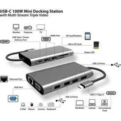 The 11-port USB-C 100W Mini Docking Station is your home-office connectivity solution. Slipping easily into your laptop bag, it’s also your road-ready travel companion- keeping you connected everywhere you go. At home or on the road, you can expect the unexpected in connectivity options. No worries, the VP6950 has your back, and your connection! Join local-area-networks. Display 4K & HD presentations and multimedia content on external monitors, projectors and flat-screens. Connect to mobile phones, tablets, peripherals and more; or charge your laptop and devices via the VP6950’s 100W USB-C Power Delivery port.