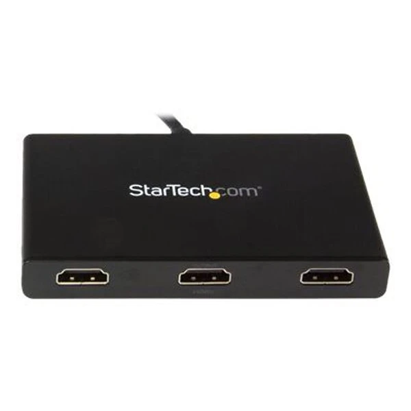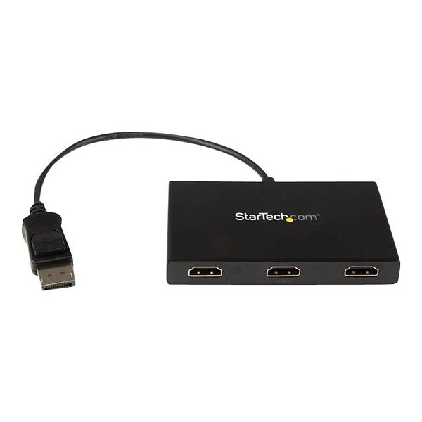 The StarTech.com® black DisplayPort to 3x HDMI multi stream transport hub allows to connect up to three independent displays to your computer. It lets you connect your DisplayPort computer to HDMI televisions, monitors or projectors. This transport hub supports resolutions up to 4K. Using your DisplayPort computer, this hub allows you to create a panoramic video wall for HDMI digital signage applications. It is great for spanning a spreadsheet or worksheet across three displays to avoid side scrolling. This transport hub mirrors the image onto multiple HDMI televisions or projectors for remote viewing applications. It works with monitor, Windows laptop, Ultrabook, desktop, televisions and projectors.