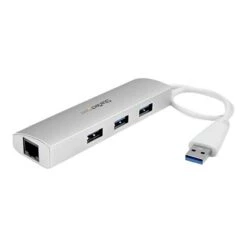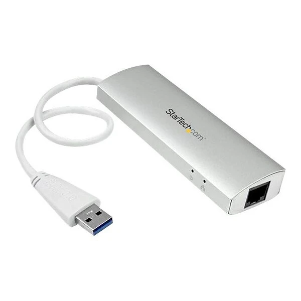 The StarTech.com® ST3300G3UA 3-port USB 3.0 hub with 1-GbE port in a rugged aluminum housing, helps to expand your connectivity for your USB enabled computer. This travel friendly USB hub with a portable, lightweight design and built-in cable offers flexible desk placement options and supports wake-on-LAN, energy efficient Ethernet, jumbo frames, full duplex flow control, VLAN tagging and layer 2 priority encoding. The compact design of this USB hub makes it portable and it offers fast, easy installation without any drivers. This hot swappable USB hub offers plug-and-play convenience.