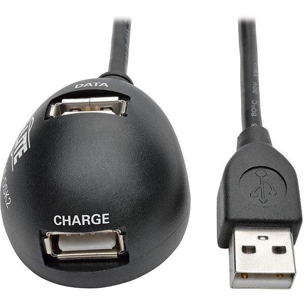 Connect the U024-005-DSK2 2-Port USB 2.0 Hi-Speed Desktop Extension Cable (M/2xF) to your computer’s existing USB-A port to add an extra USB port and extend both ports up to five feet away. This flexibility allows you to place the cable’s desktop hub with two female USB 2.0 ports within easy access next to your keyboard, on a nearby shelf, behind a monitor or anywhere else you find convenient. It’s especially recommended for moving a rear USB port somewhere easier to access. A black padded base provides stability.The U024-005-DSK2 features one standard USB 2.0 data/power port and one power-only port. It supports data transfer rates up to 480 Mbps for both low- and high-speed devices, including multimedia applications. Premium foil and braid shielding delivers reliable, error-free signal quality and protection from EMI/RFI line noise. Molded nickel-plated connectors with gold-plated contacts ensure excellent conductivity. Integral strain relief ensures the cable and connectors last a long time. A rugged PVC jacket protects twisted 28 AWG data lines and 24 AWG power lines. Features Expands an Existing USB-A Port to 2 Ports and Extends Them an Extra 5 ft. Move a hard-to-reach USB port within easy access Ideal for connecting external hard drives, thumb drives, digital cameras and other USB-A devices Features one USB 2.0 data/power port and one power-only port Supports data transfer rates up to 480 Mbps Backward compatible with earlier USB generations First-Rate Construction for Superior Signal Transfer Premium foil and braid shielding for EMI/RFI noise protection Molded nickel-plated connectors for optimal signal quality Integral strain relief for long life Twisted 28/24 AWG data/power lines Flexible PVC jacket easy to install in tight spaces Black padded non-sliding base