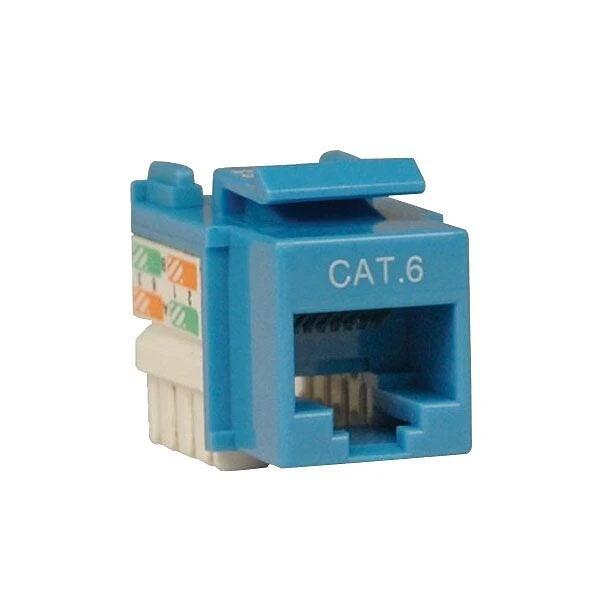 Tripp Lite 110 Style punch down keystone jack in blue color has RJ-45 female network connectors and provides flexibility for UTP Ethernet. Jack has patterned printed circuit board construction which is designed to meet CAT6 performance.